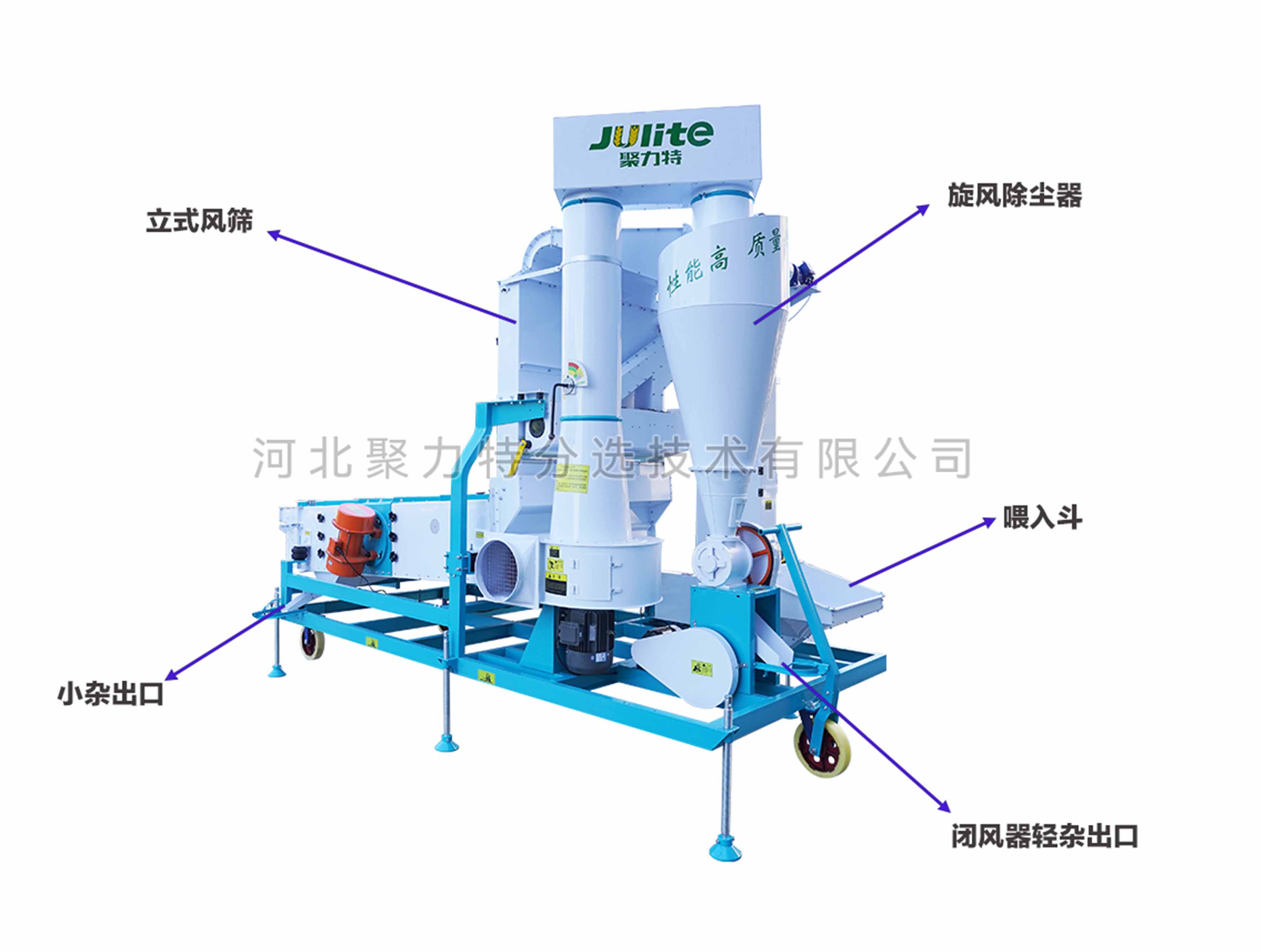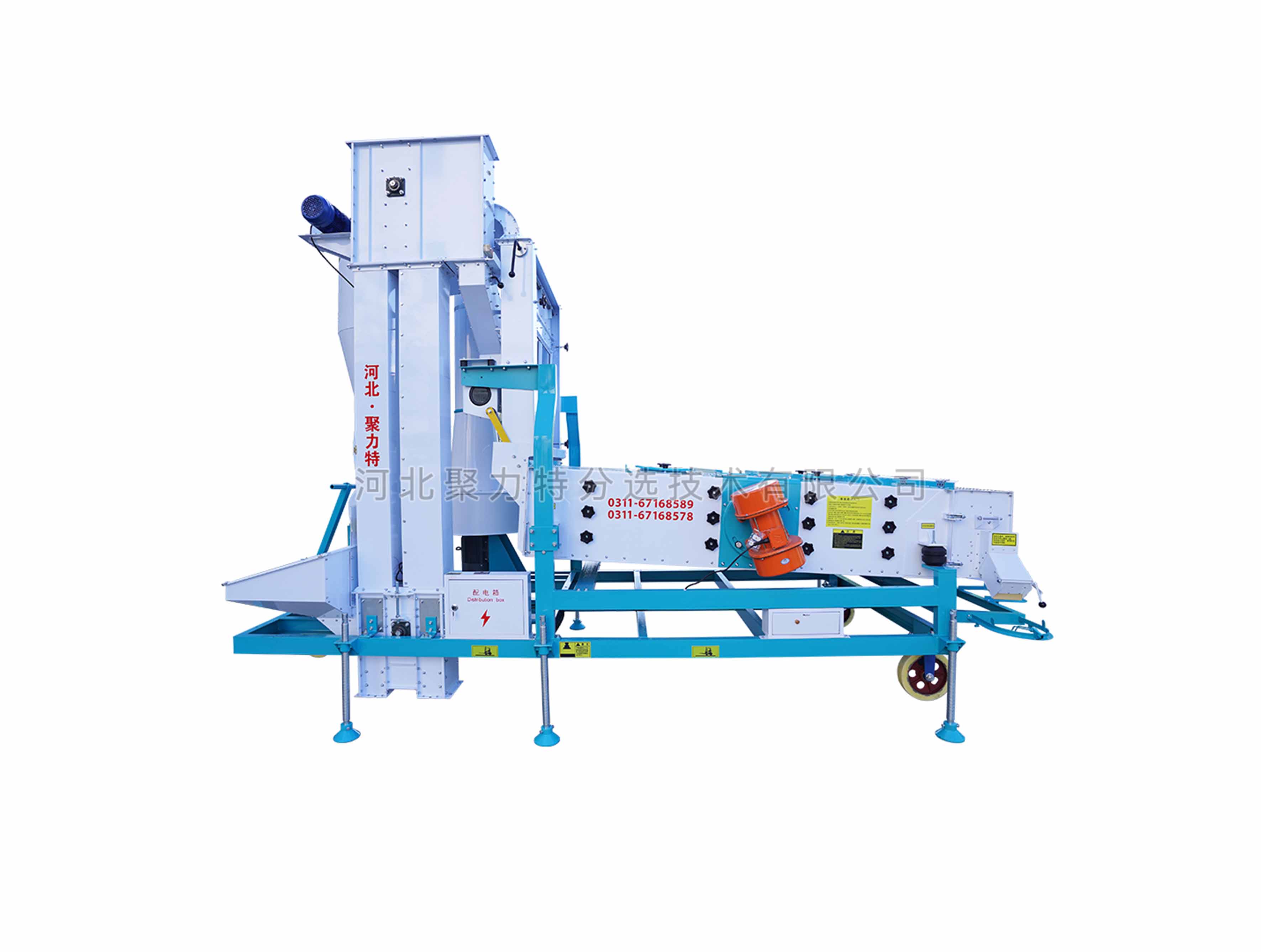 物料通過提升機(jī)進(jìn)入散糧箱,散糧均勻后進(jìn)入立式空氣篩,物料在風(fēng)力的作用下分離出輕雜質(zhì),經(jīng)旋風(fēng)除塵器過濾后,由閉風(fēng)器排出。物料進(jìn)入振動(dòng)篩,根據(jù)物料的外形尺寸來調(diào)整不同規(guī)格的精密沖孔篩片,去除大雜和小雜同時(shí)通過增減篩片的層數(shù)將成品分成大粒和中小粒。