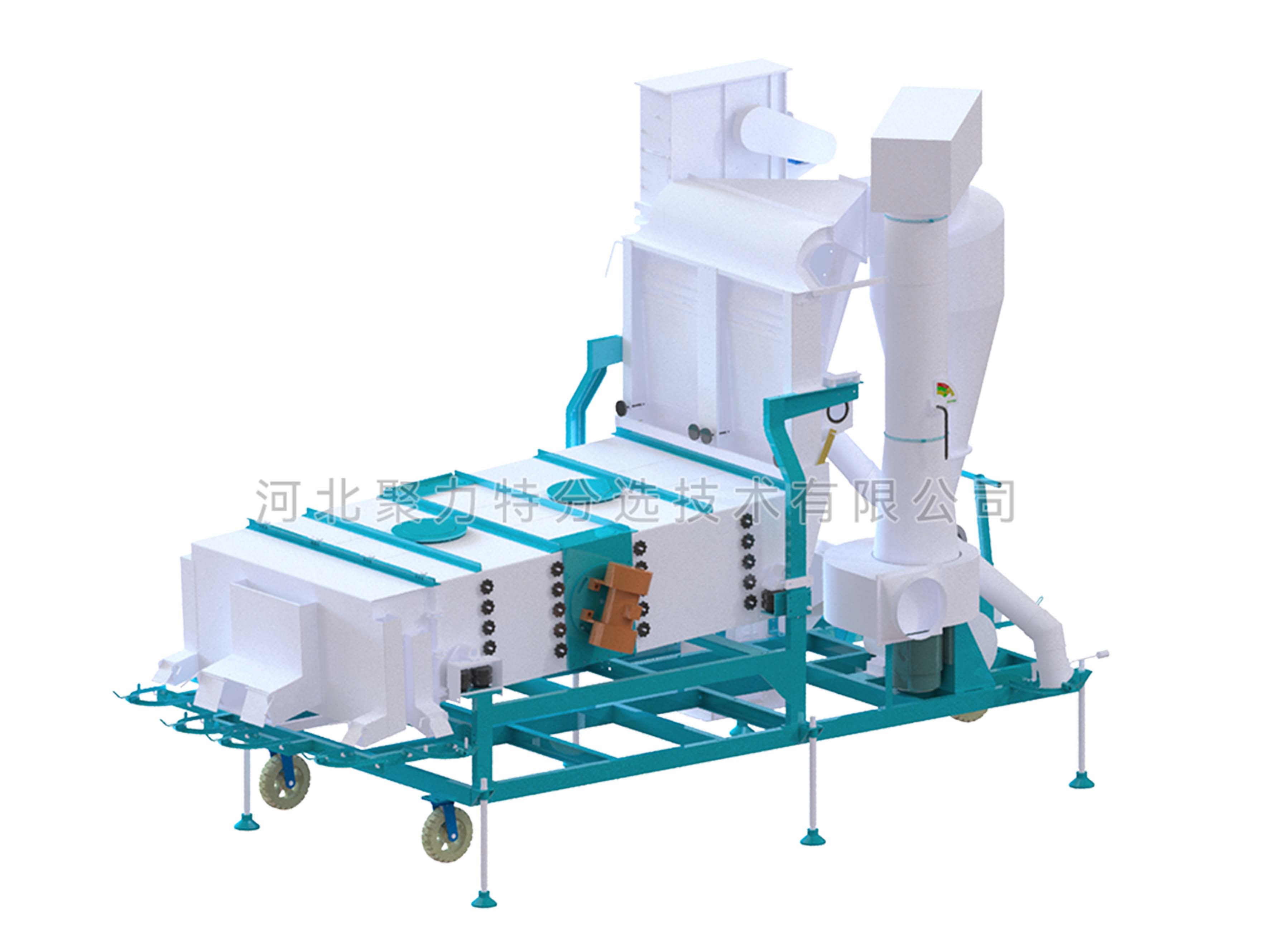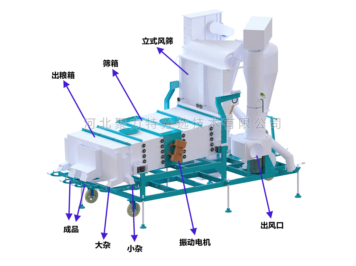 物料通過提升機進入散糧箱,散糧均勻后進入立式空氣篩,物料在風力的作用下分離出輕雜質,經(jīng)旋風除塵器過濾后,由閉風器排出。物料進入振動篩,根據(jù)物料的外形尺寸來調整不同規(guī)格的精密沖孔篩片,去除大雜和小雜同時通過增減篩片的層數(shù)將成品分成大粒和中小粒。
